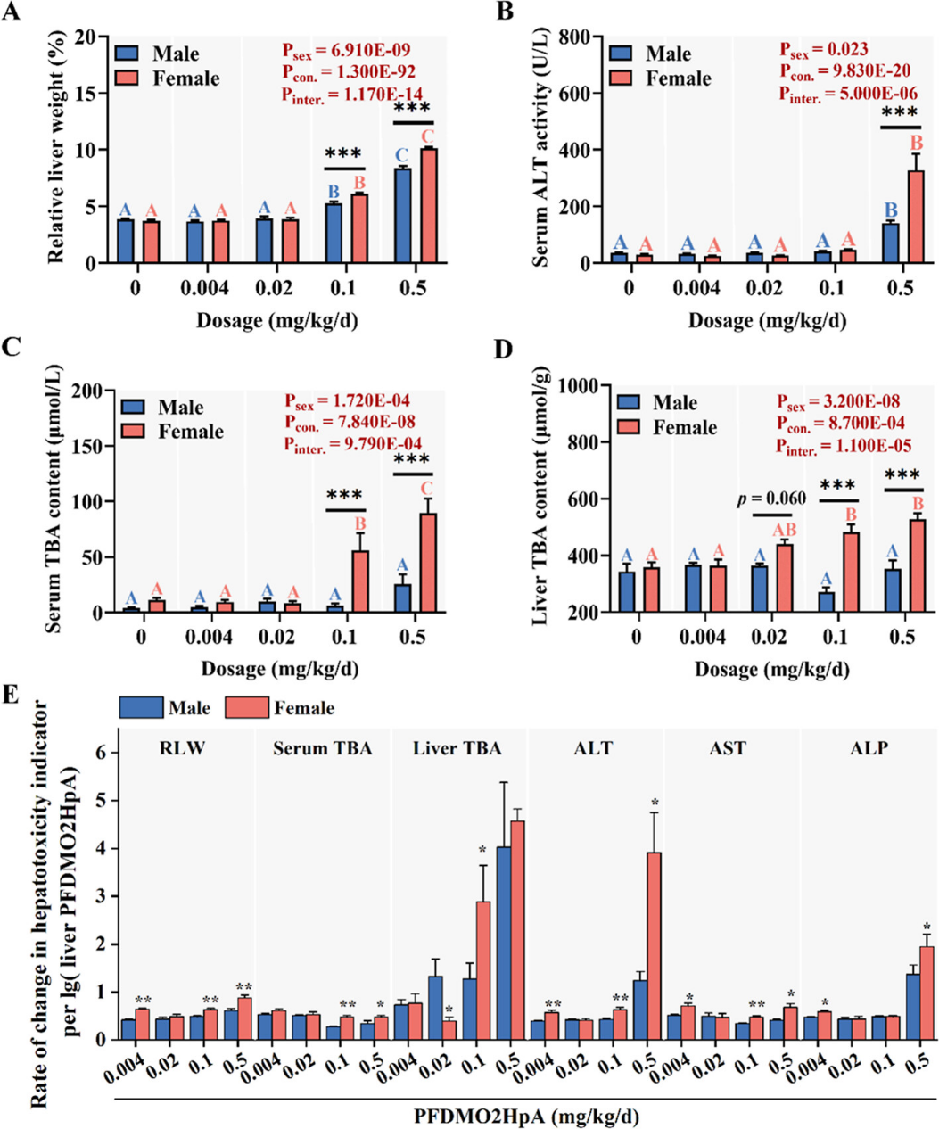 毒性评价结果显示,雌性小鼠表现出更为严重的肝损伤:在0.5 mg/kg/d剂量下,雌性相对肝重量增加172.12%,显著高于雄性的118.49%;血清中肝损伤指标ALT、AST和ALP活性分别升高994.49%、84.50%和459.75%,且胆汁酸代谢紊乱尤为突出,血清和肝脏总胆汁酸水平分别增加687.76%和47.23%(图2)。即使在调整内暴露水平后,雌性仍表现出更高的生物学敏感性(图2E)。基于雌雄小鼠肝肿大、血清肝损伤指标水平及胆汁酸盐水平,推导得出PFDMO2HpA的参考剂量为6.67 ng/kg/d,低于其同系物HFPO-DA的参考剂量(30 ng/kg/d美国环保署)。团队前期研究发现,氟化工园区周边2-11岁儿童通过膳食摄入PFDMO2HpA的暴露水平达7.52-8.49 ng/kg/d,已超过参考剂量,而12岁以上居民的摄入水平也已经接近参考剂量,提示氟化工园区周边居民可能面临PFDMO2HpA暴露的潜在健康风险,值得进一步调查和公共卫生关注。