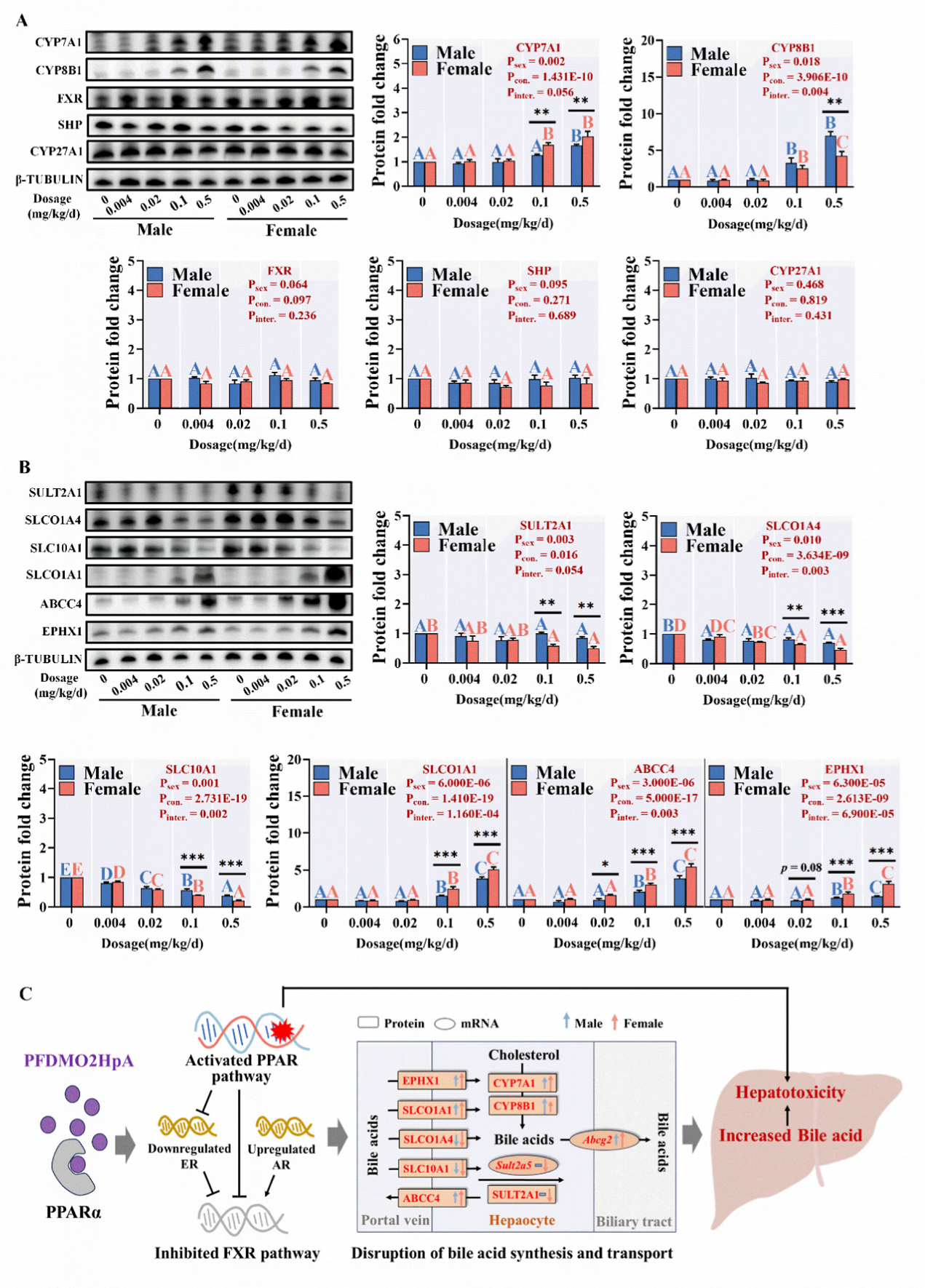 图4. PFDMO2HpA暴露后雌雄小鼠胆汁酸合成及代谢相关蛋白的表达水平