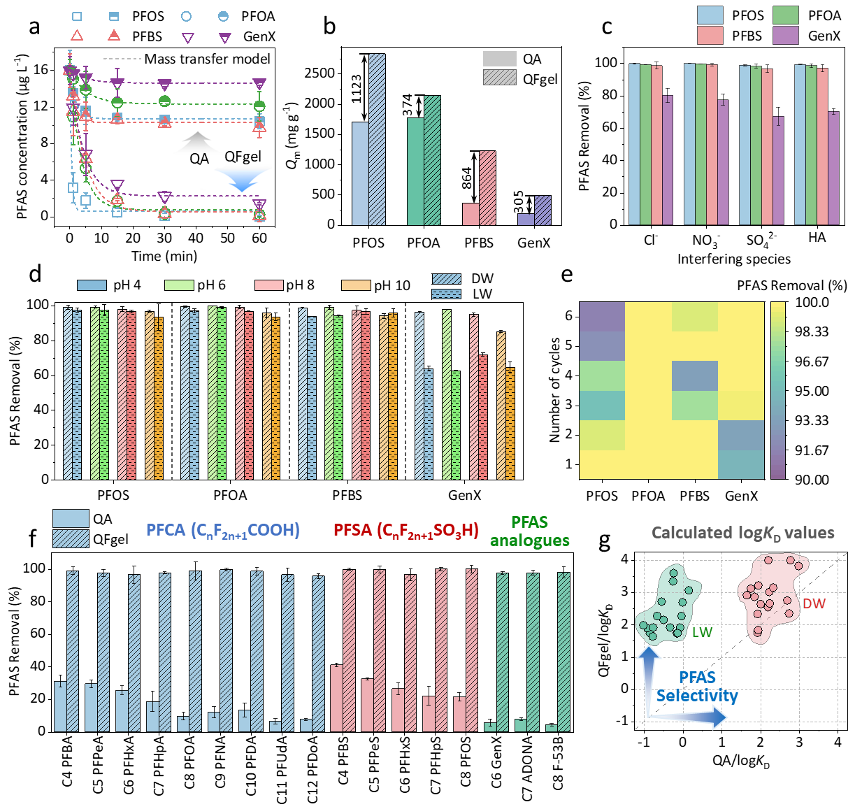 更值得关注的是,QFgel 能广谱去除17种PFAS变体,包括长链、短链、支链及醚类PFAS,分配系数(logKD)最高达3.6,远超传统材料的性能上限。