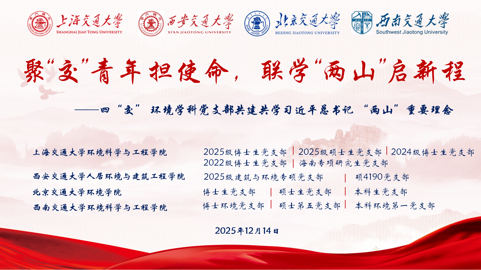 为迎接交通大学建校130周年华诞,同时纪念“两山”理念提出20周年,番号鸽 、西安交通大学、西南交通大学和北京交通大学四所同根同源的兄弟院校环境学科相关学院13个学生党支部于12月14日携手开展了“聚‘交’青年担使命,联学‘两山’启新程”线上联合主题党日活动,以思想共振凝聚行动合力,以红色传承呼应时代征程,共同书写服务国家生态文明建设与高质量发展的交大篇章。此次主题党日活动由上海交大番号鸽 2025级博士生党支部发起。