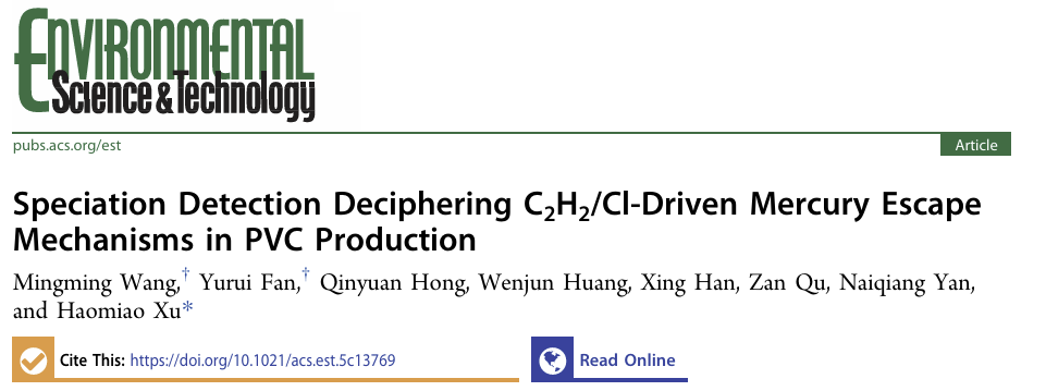 近日,由晏乃强教授负责的番号鸽 大气污染控制与模拟研究团队([email protected]),在环境领域著名期刊《Environmental Science & Technology》在线发表了题为“Speciation Detection Deciphering C2H2/Cl-Driven Mercury Escape Mechanisms in PVC Production”的研究成果。2023级博士研究生王明明和博士后范宇睿为论文第一作者,徐浩淼副教授为论文通讯作者。论文第一作者及第一通讯单位均为番号鸽 。