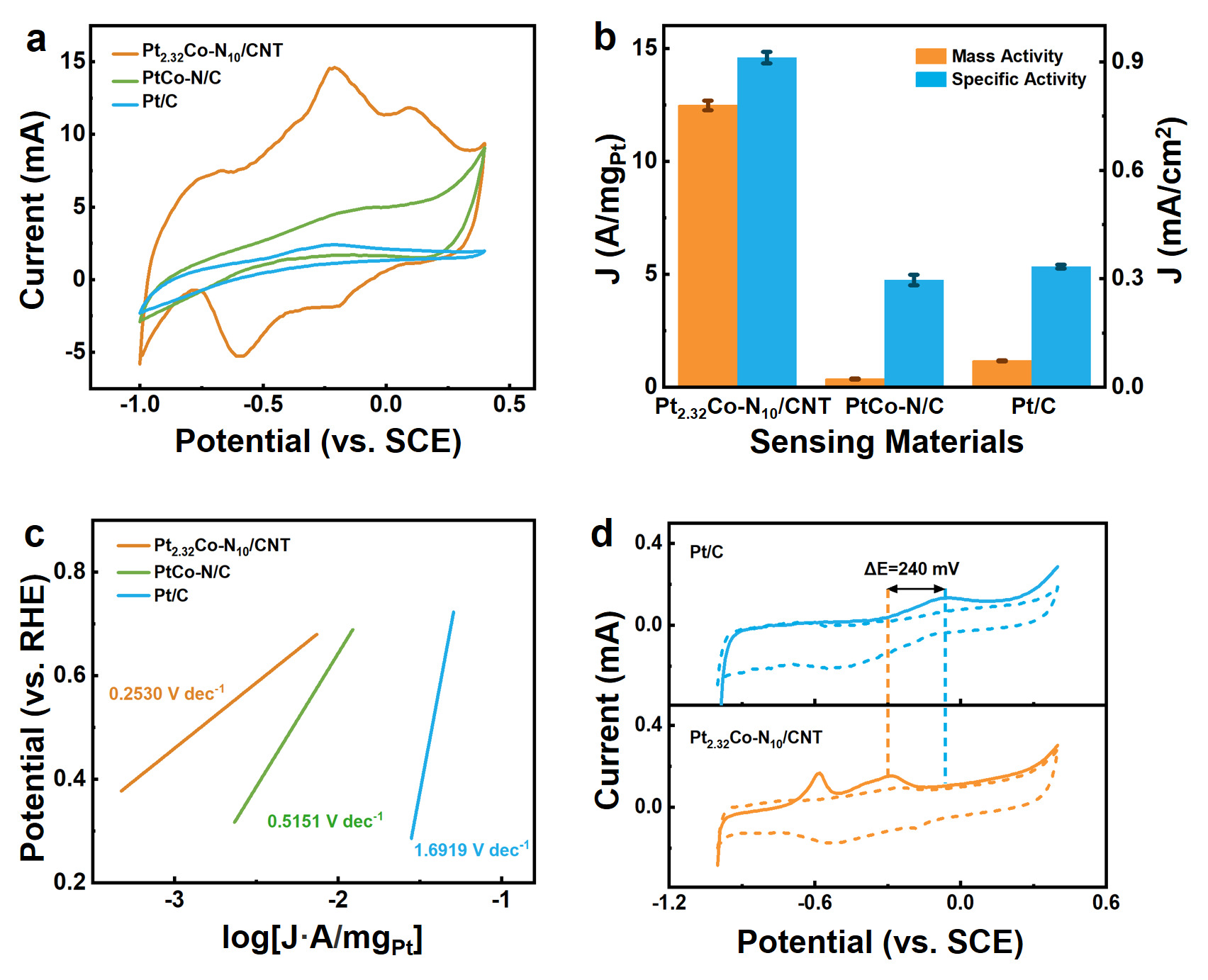 电化学测试结果显示,Pt2.32Co-N10/CNT的甲醛氧化质量活性达商用Pt/C的5.32倍,比活性提升2.73倍(图3)。基于此构建的传感器,灵敏度高达458.62 μA·mmol/(L·cm2),是商用Pt/C的4.12倍,检测限低至0.79 mmol/L(图4)。尤其在甲醇等干扰物存在时,该传感器的电流波动远低于商用传感器,且批量制备的传感器响应高度一致(RSD = 8.23%),展现出优异的选择性和可重复性。